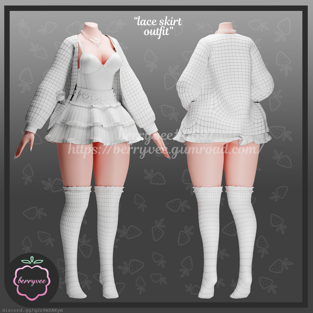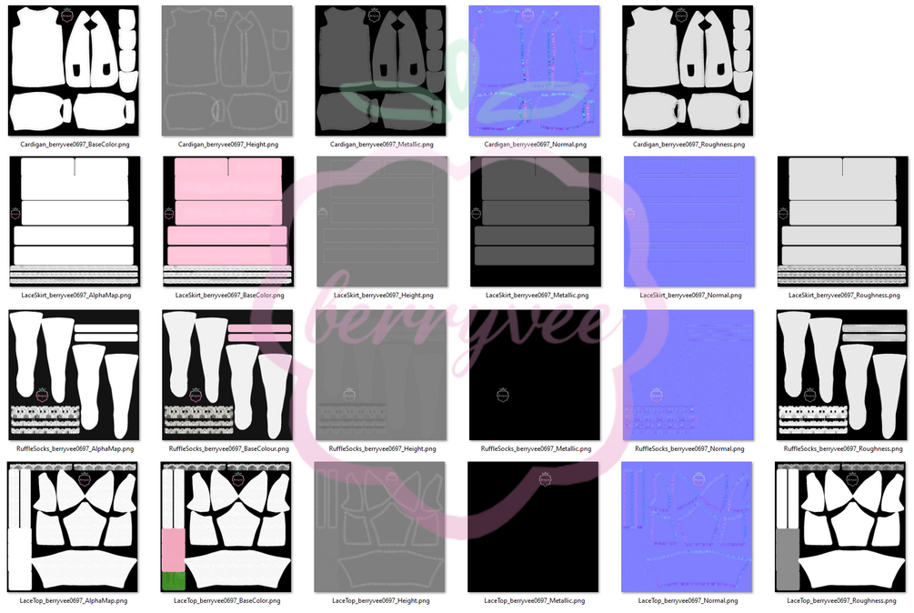 Ā» 1 fbx file: 7 meshes = cardigan, top, skirt, socks, heart belt, necklaces and pocket rose.